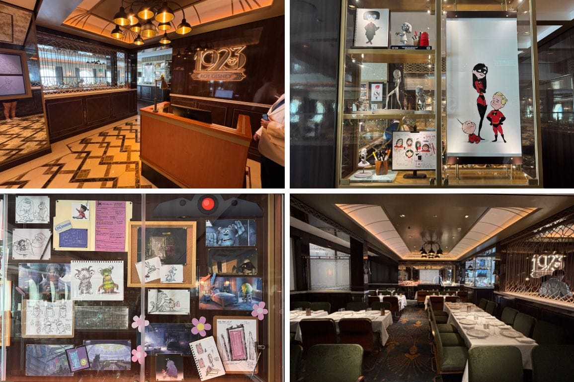 The restaurant’s name honors the founding year of The Walt Disney Company, grounding the experience in Disney history. The atmosphere is inspired by classic Hollywood aesthetics, and the dining space showcases dozens of these art exhibits – spotlighting hundreds of pieces of animation artwork, sketches, and design elements that celebrate Disney’s legacy.